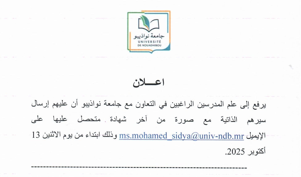 يرفع إلى علم المدرسين الراغبين في التعاون مع جامعة نواذيبو أن عليهم إرسال سيرهم الذاتية مع صورة من آخر شهادة متحصل عليها […]